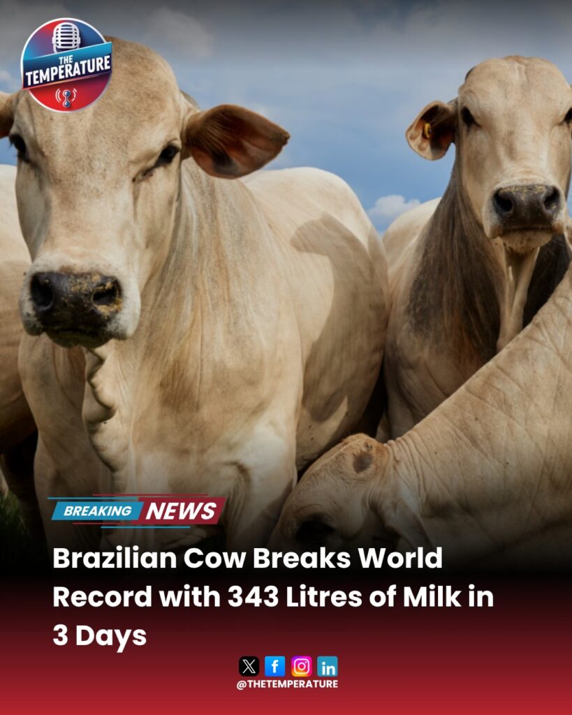 A dairy marvel in Brazil has shattered records, with a cow producing a staggering 343 litres of milk in just three days averaging 114 litres per day, far beyond the usual 12–35 litres. Reported by 24NewsHD TV, the achievement is credited to exceptional genetics, a carefully crafted diet, expert care, and cutting edge farming techniques. Believed to be from a high-yield breed like the Holstein, this remarkable feat showcases how science and technology are revolutionizing dairy production, setting new benchmarks for efficiency and productivity in the industry.