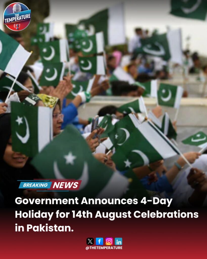 The government has officially announced a 4-day public holiday across Pakistan in connection with the country’s 14th August Independence Day celebrations. The extended break will allow citizens to participate fully in patriotic events, family gatherings, and recreational activities. Public and private offices, schools, and many businesses will remain closed during this period. The decision has been welcomed by the public, as it provides an opportunity for relaxation, travel, and honoring the spirit of independence with national pride. #PakistanIndependenceDay #14August #PakistanZindabad #IndependenceDay2025 #PakistaniPride #4DayHoliday #AzadiMubarak #PakistaniPatriotism #CelebrateFreedom #PakistaniCulture #PakistanCelebrations #AzadiDay #PakistaniSpirit #LongWeekendPakistan #PakistanTravel #PakistaniUnity #PakistaniEvents